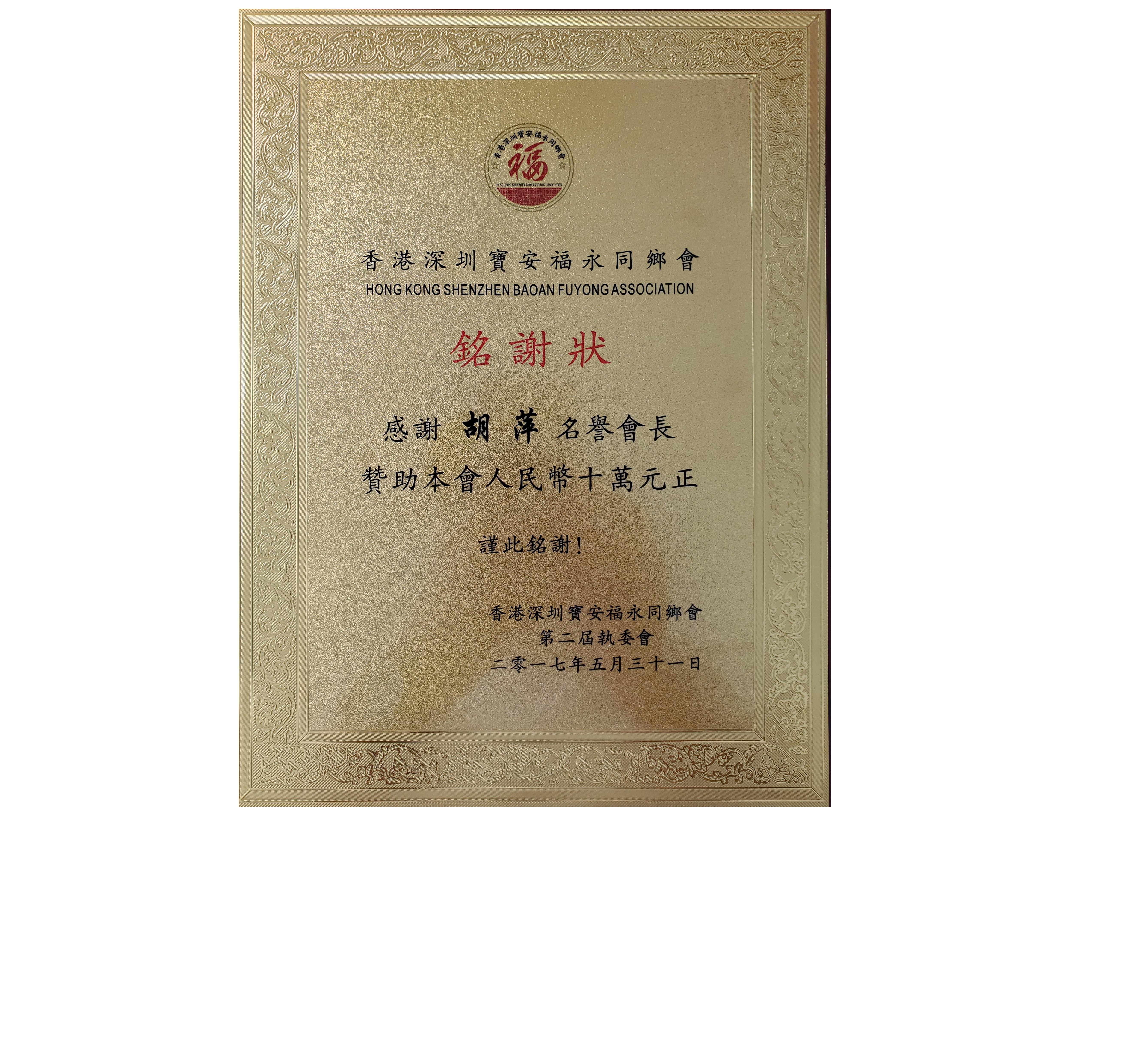 • 香港深圳寶安福永同鄉(xiāng)會(huì)銘謝狀